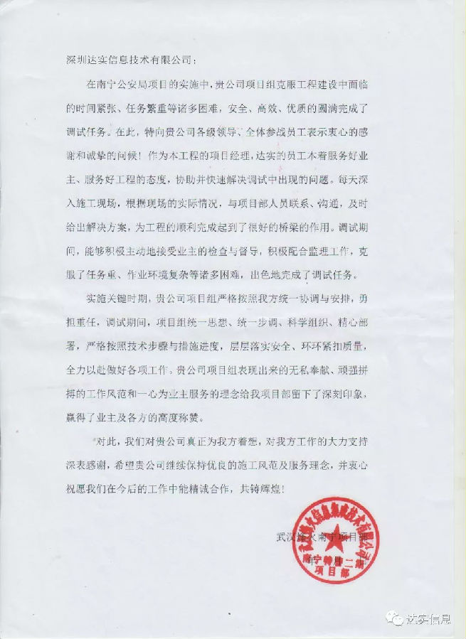 炎炎夏日,濃濃情誼,近日,達(dá)實(shí)信息收到了一封來(lái)自合作伙伴——武漢烽火南寧項(xiàng)目部的表?yè)P(yáng)信。