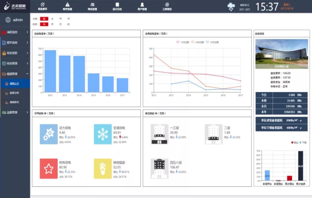 考慮到單位多、人員復雜、服務事項繁雜等特點,株洲市民中心采用了達實IBMS綜合監(jiān)控管理平臺作為后勤支持,將數(shù)據(jù)匯集到管理平臺形成集中管理。達實基于智能建筑管理平臺集成了:視頻監(jiān)控系統(tǒng)、設(shè)備監(jiān)控系統(tǒng)、門禁管理系統(tǒng)、停車場管理系統(tǒng)、能源管理系統(tǒng)以及梯控系統(tǒng)。結(jié)合互聯(lián)網(wǎng)、物聯(lián)網(wǎng)、云計算、大數(shù)據(jù)、人工智能等最新技術(shù),將不同功能的建筑智能化子系統(tǒng)及相關(guān)設(shè)備進行綜合管控,打通信息共享渠道,實現(xiàn)智慧建筑內(nèi)人工環(huán)境的最舒適調(diào)節(jié),機電設(shè)備的節(jié)能最優(yōu)化控制以及物業(yè)管理人員的決策輔助等功能。