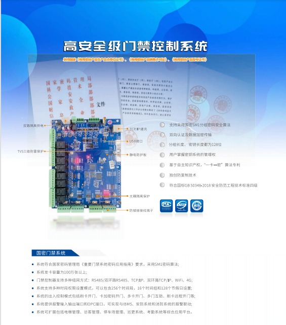 • 國(guó)密四級(jí)認(rèn)證門禁系統(tǒng) - 符合國(guó)家密碼管理局標(biāo)準(zhǔn),確保訪問(wèn)安全