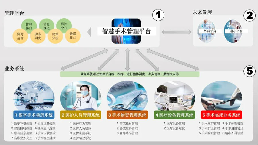 五大系統(tǒng)涵蓋了圍術(shù)期整個運(yùn)轉(zhuǎn),通過統(tǒng)一的智慧手術(shù)管理平臺實(shí)現(xiàn)統(tǒng)一的任務(wù)發(fā)布(排班、排臺)、消息推送(流轉(zhuǎn)信息統(tǒng)一處理)、質(zhì)控中心(動態(tài)監(jiān)測手術(shù)質(zhì)控)、實(shí)時運(yùn)營(整體調(diào)度手術(shù)進(jìn)展、5大系統(tǒng)業(yè)務(wù)協(xié)同)、決策分析(通過大量手術(shù)運(yùn)行數(shù)據(jù)進(jìn)行分析,輔助管理者決策)、數(shù)據(jù)接口(所有信息系統(tǒng)、物聯(lián)網(wǎng)系統(tǒng)的數(shù)據(jù)統(tǒng)一管控,與院區(qū)互聯(lián)互通),最終形成圍術(shù)期的全程分析。
