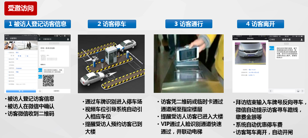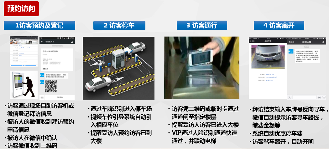 智慧訪客管理系統(tǒng)主要由訪客管理系統(tǒng)、微信一卡通平臺(tái)、APP一卡通平臺(tái)等組成,且與通道、梯控、門禁、停車場(chǎng)等系統(tǒng)無縫對(duì)接。