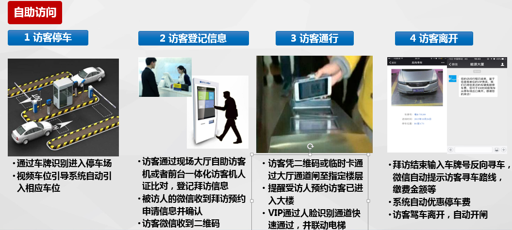 訪客來訪有三種登記方式:現(xiàn)場(chǎng)登記、被訪人通過APP主動(dòng)邀約、來訪人員通過關(guān)注微信公眾號(hào)進(jìn)行來訪預(yù)約。