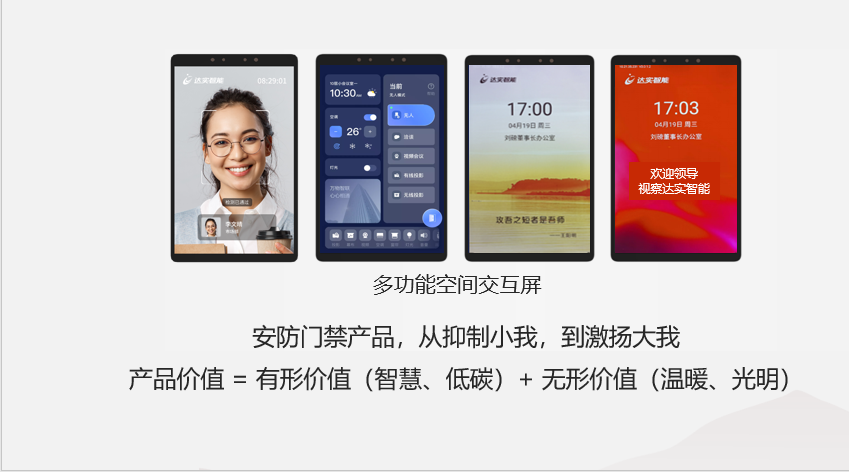 如何實(shí)現(xiàn)溫暖?這是一個屏幕,通常叫做安防產(chǎn)品,刷臉開門,安全防范。圣賢思想告訴我們,不僅要抑制人的小我,更要激揚(yáng)人心中的大我,所以這個不應(yīng)該是安防產(chǎn)品,它不僅要控制黑名單上的人不能進(jìn)來,更應(yīng)該是歡迎尊貴的客人。由此創(chuàng)新硬件、軟件產(chǎn)品,把整個空間和人互聯(lián)互通,體現(xiàn)溫暖。
