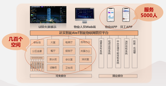 通常我們講“以客戶為中心,看客戶的需求”,我們通常只看第一行、第一列的客戶需求。第一行是采購產(chǎn)品和服務(wù)的部門需求,第一列是他有形的需求。但我們不應(yīng)該只看到這個大樓智能化采購者的有形需求,還要看到他們的無形需求,還要看到樓里邊的物業(yè)管理、辦公人員,甚至是訪客的有形需求和無形需求。有了這個,再加上對客戶的深度、廣泛洞察,我們自然就能創(chuàng)新出解決方案。通常的智能化解決方案,只服務(wù)于少數(shù)物業(yè)、設(shè)備、機(jī)電、工程師,達(dá)實(shí)服務(wù)了5000個各類最終使用的員工,包括每位到達(dá)實(shí)去的人,實(shí)現(xiàn)了從控制物到服務(wù)人的本質(zhì)變化。以前把一個大廈看作是一個整體的復(fù)雜定制,今天我們透過這個整體,看到里邊幾百個單元空間,我們?yōu)樗麄儎?chuàng)造場景應(yīng)用系統(tǒng),幾百個場景應(yīng)用系統(tǒng)直接上云,顛覆了整個物聯(lián)網(wǎng)技術(shù)在大樓、在產(chǎn)業(yè)園區(qū)應(yīng)用的傳統(tǒng)的架構(gòu)。如此,我們實(shí)現(xiàn)了綠色和智慧。