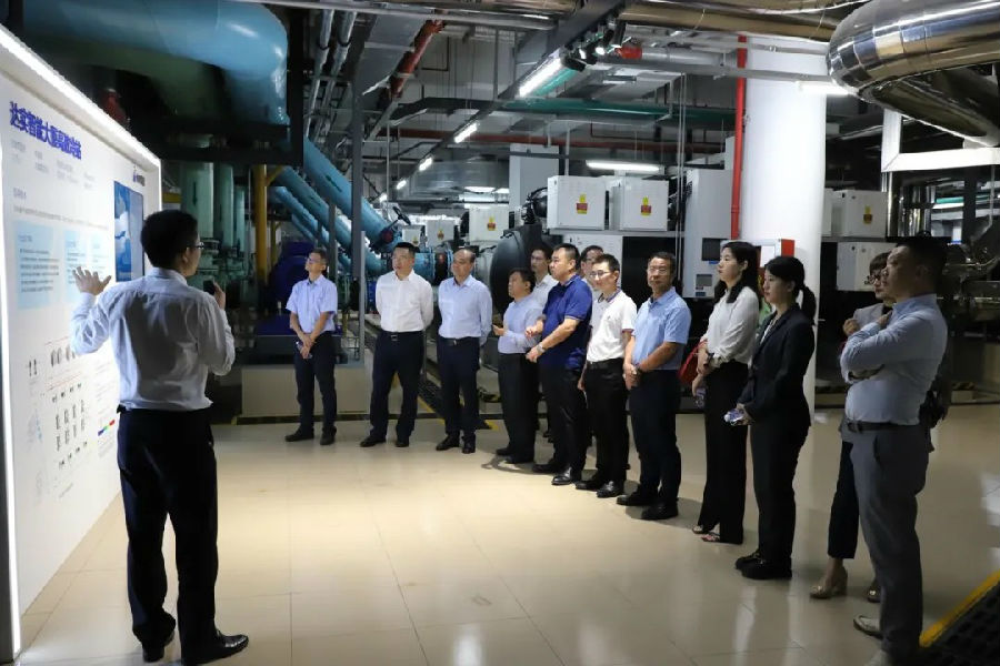 (來訪嘉賓參觀達(dá)實物聯(lián)網(wǎng)科技展示中心)接著,大家來到達(dá)實大廈的節(jié)能“心臟”——無人值守超高效冷站機房參觀。機房占地面積450平方米,滿足總面積10萬平方米的達(dá)實大廈的供冷需求,使用了達(dá)實自主研發(fā)的EMC007中央空調(diào)節(jié)能控制系統(tǒng),并結(jié)合達(dá)實自主研發(fā)的AIoT物聯(lián)網(wǎng)智能管控平臺,全年綜合制冷能效系數(shù)SCOP達(dá)到6.38。