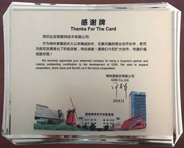 我們與格林美的合作還在如火如荼地進(jìn)行著,目前我們?nèi)栽诶^續(xù)跟進(jìn)各廠區(qū)的智能化建設(shè)需求。持續(xù)不斷地提供設(shè)備、技術(shù)支持;打磨解決方案;全力配合項(xiàng)目進(jìn)度,實(shí)現(xiàn)方案落地。今天,一塊沉甸甸的感謝牌從格林美股份有限公司交與達(dá)實(shí)手中!對(duì)方表示:“作為格林美集團(tuán)長(zhǎng)久以來精誠(chéng)協(xié)作、互惠共贏的商業(yè)合作伙伴,貴司為我司發(fā)展做出了積極貢獻(xiàn),特此感謝!愿我們今后擴(kuò)大合作、傳遞價(jià)值、成就你我!”在此我們感謝格林美股份有限公司的信任和認(rèn)可,我們深知達(dá)實(shí)物聯(lián)的發(fā)展離不開每一位合作伙伴的支持和鼓勵(lì)!在今后的工作中,我們將一如既往,用心為客戶提供成熟可靠的產(chǎn)品及服務(wù)解決方案。期待與每一位合作伙伴攜手并進(jìn),精誠(chéng)合作,共贏未來。